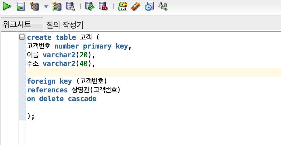 +3)foreign key (속성이름) references 테이블이름(속성이름) on delete | update 옵션