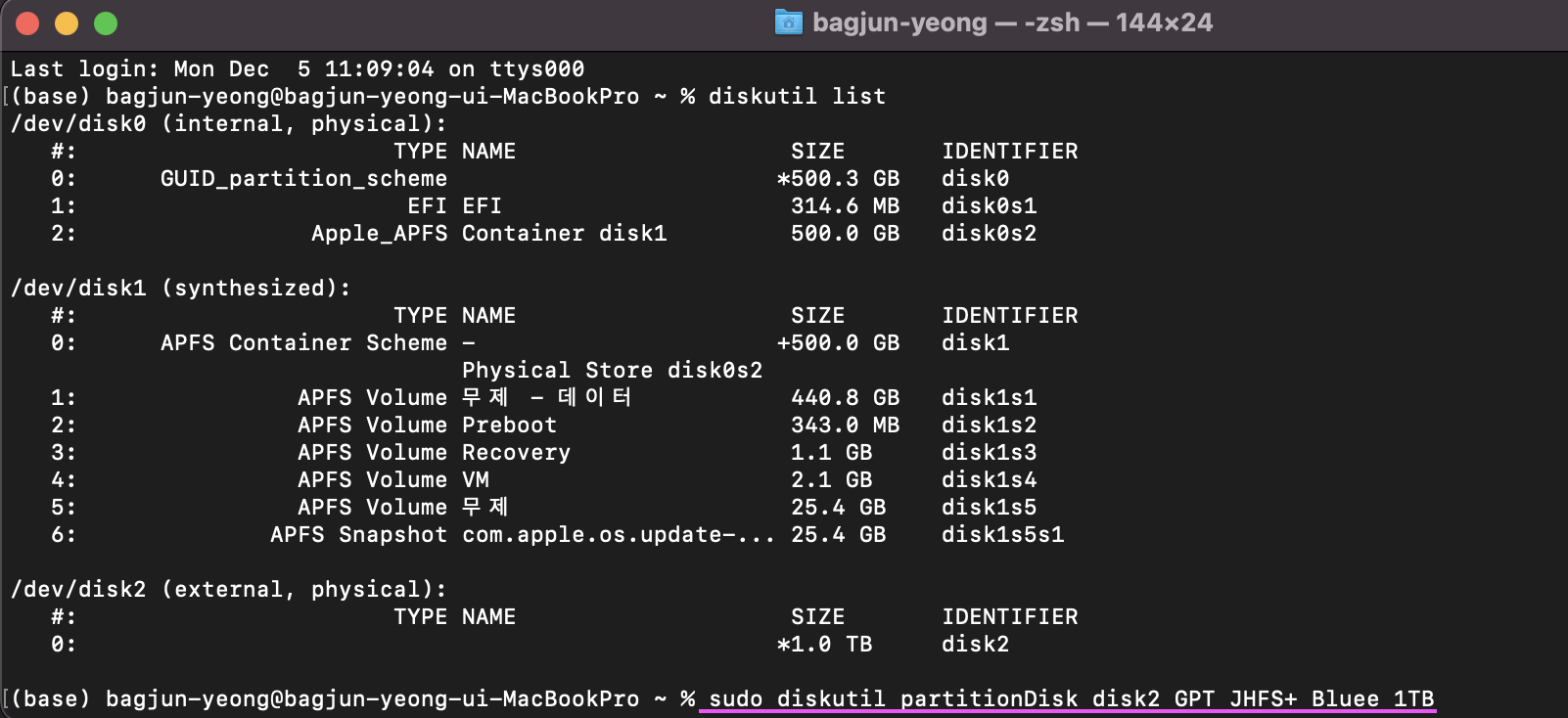 diskutil partitionDisk disk2 GPT JHFS+ Bluee 1TB